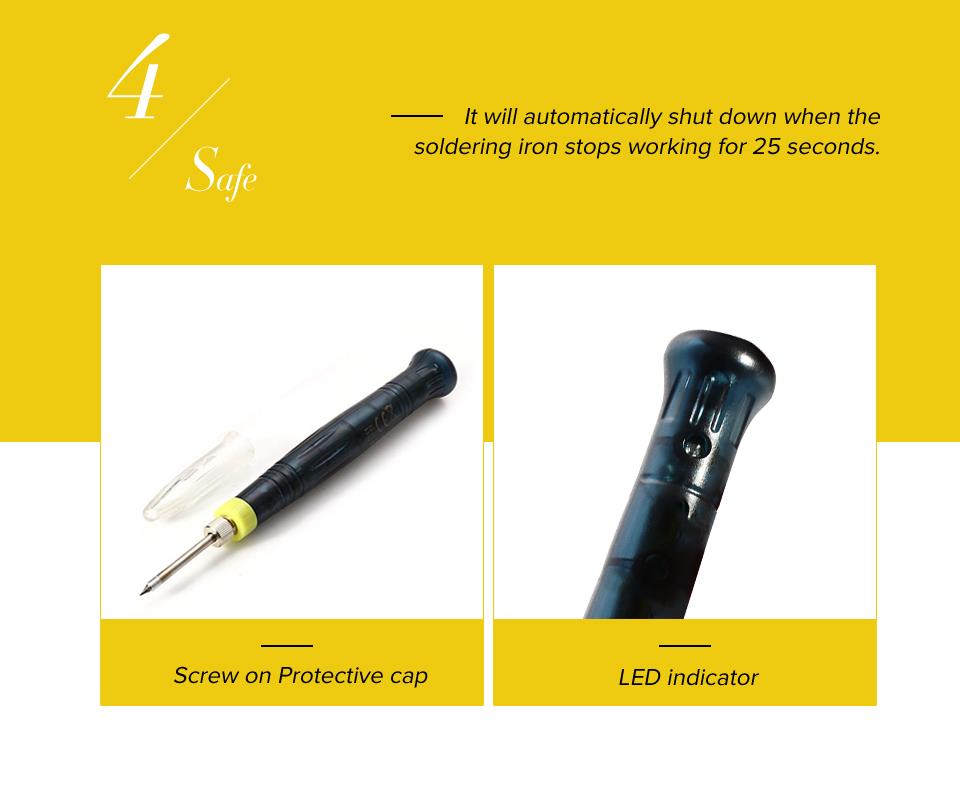 Sightly touching the metal point on the body of the soldering pen, then the LED light will be lightened up and job can be started