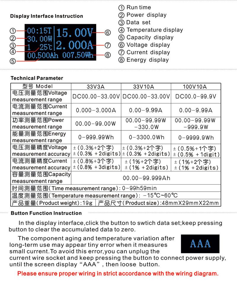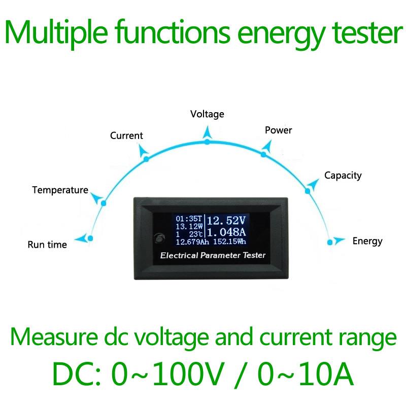 • The 7in1 OLED multifunction tester can test voltage, current, run time, power, capacity, temperature and energy.